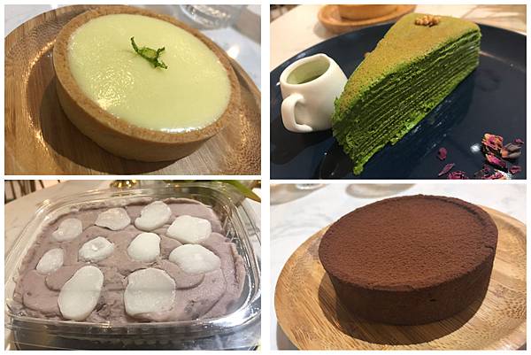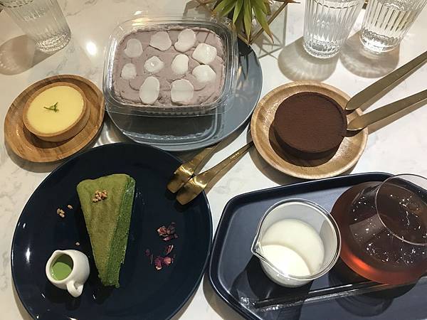 除了早就訂購的芋頭盒子,還點了檸檬塔、預留的抹茶千層、巧克力塔,以及伯爵奶茶~