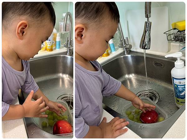 「果髒髒,要洗澡澡~」兩歲的調皮鬼很愛幫忙一起洗!
