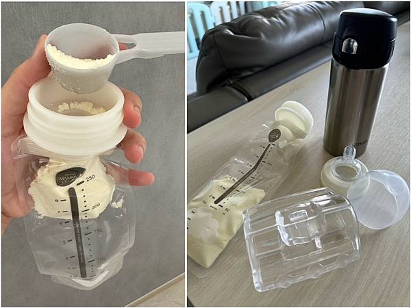事先裝好奶粉在拋棄式奶瓶袋裡,再帶個保溫瓶,
