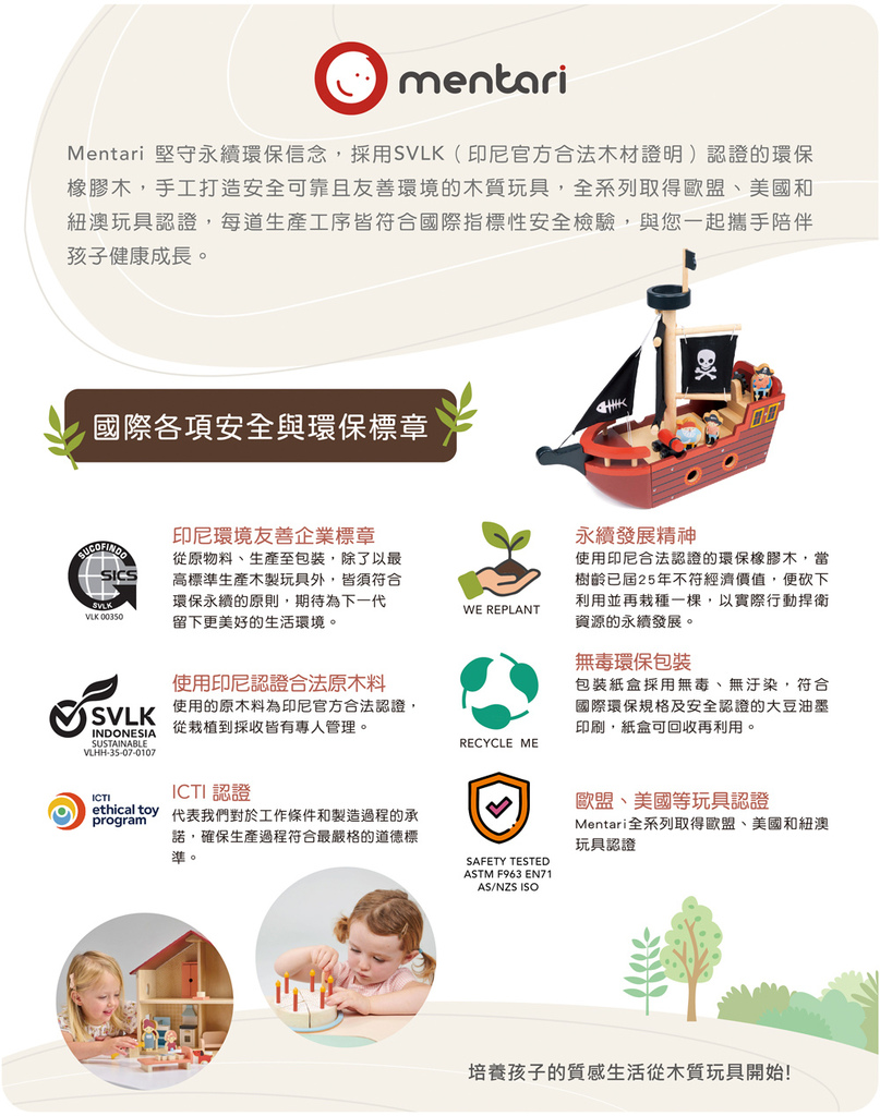 獲得印尼環境友善企業標章(產品使用印尼官方合法木材製),全系列取得歐盟、美國和紐澳玩具認證,