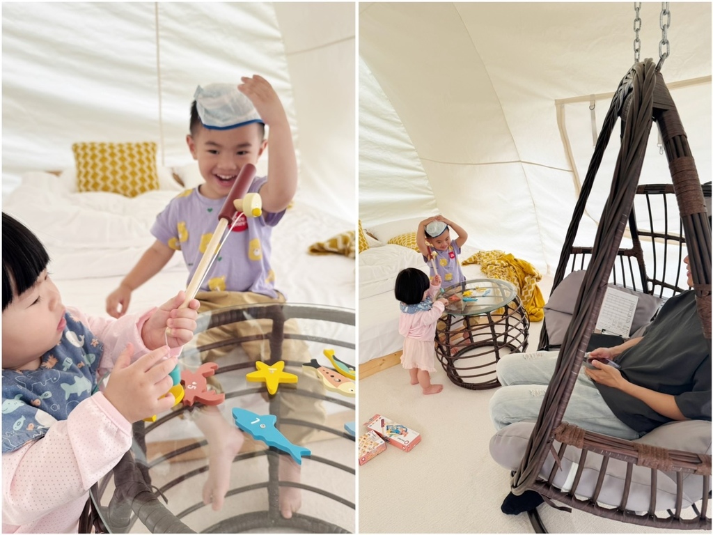剛好露營時遇到雨天,草地濕濕的又下小雨,一家人只能待在帳篷裡。