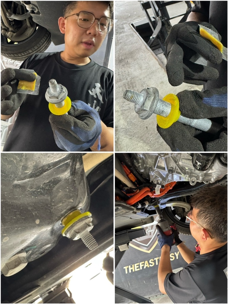 因此~在副車架鎖車體的重要螺絲上,加上黃色小小襯套,將縫填補起來,